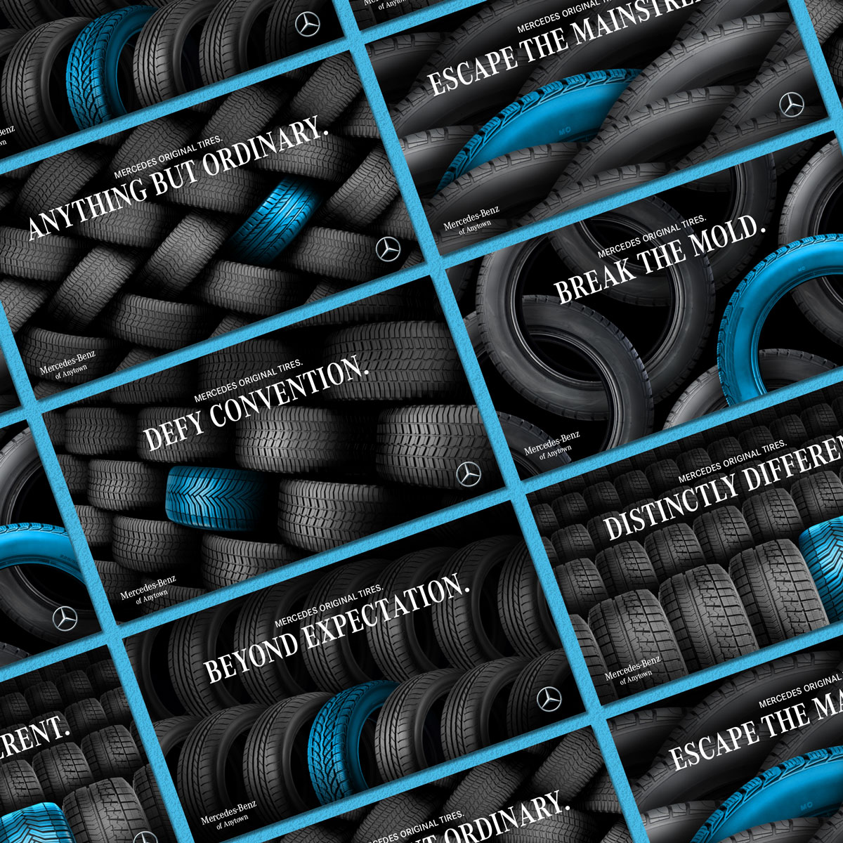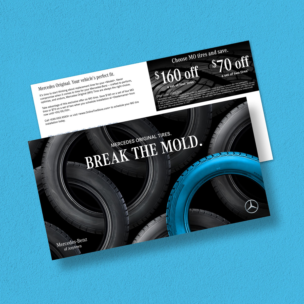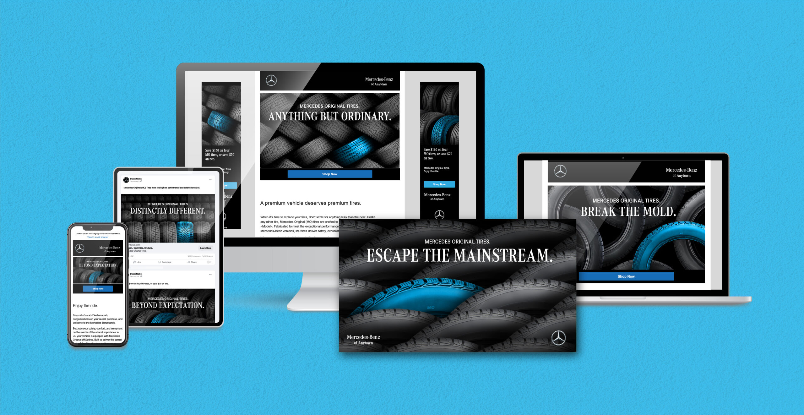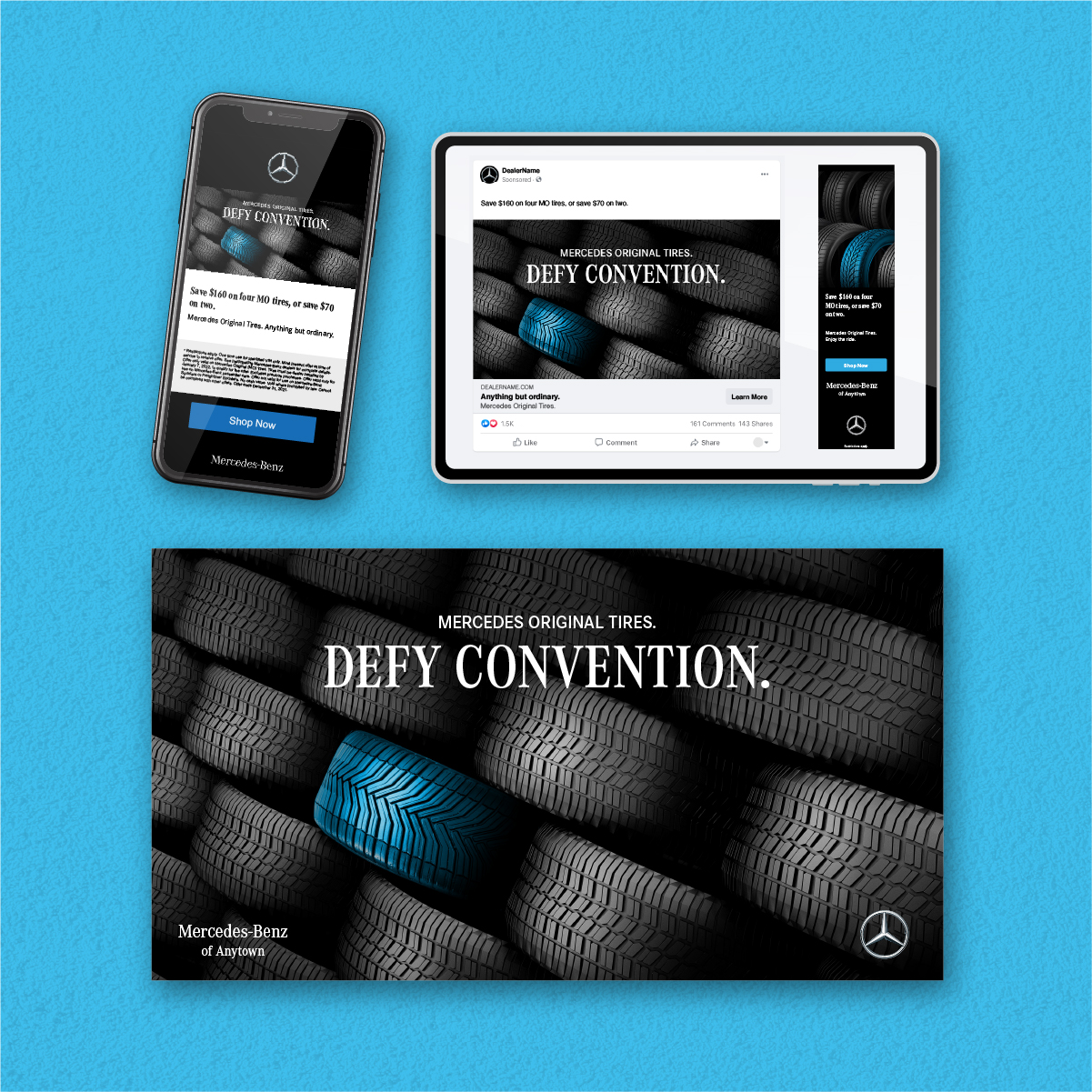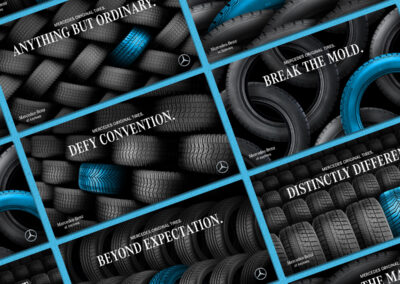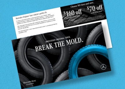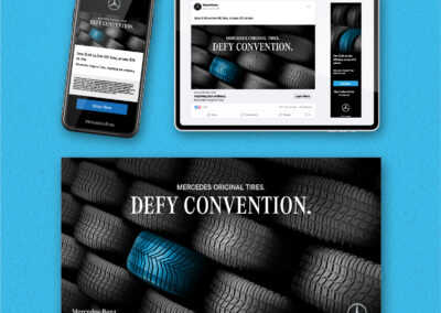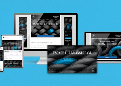 The Mercedes-Benz Tire Journey campaign promotes Mercedes Original (MO) tires through a targeted, lifecycle-driven approach. Timed to reach customers when they are due for replacement tires, the designs emphasize superior craftsmanship through Mercedes-Benz brand colors and product imagery. The campaign delivers a cohesive, high-impact experience across direct mail, email, social, and display ads.